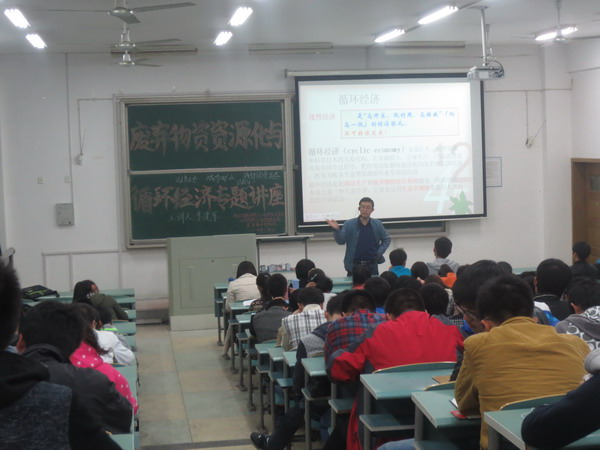 李建军从当今资源现状讲起,引用具体的事例和详细的数据向同学们讲解了当前存在的环境问题及资源急剧萎缩的现状,引出了废物物资资源化的紧迫性和重要性。接着,他重点从以下几个方面做了详细的讲解:即我国城市固体废弃物管理和分析、城市固体废弃物分类及危害、我国资源和环境污染现状、如何解决资源浪费和把废弃物变废为宝、线性经济与循环的概念、生活垃圾的处理方式等。李建军综合分析了资源管理和变废为宝等问题,期望我国改进废弃资源的处理方法,从时间和空间等方面结合处理,建立资源-产品-再生资源新经济模式,代替资源-产品-污染的落后排放模式。他用图文并茂的形式阐述了循环经济的运行模式,并用工业建筑废料、粉煤灰和PET的循环利用,证明了通过废弃物实现循环经济完全有可能实现,同时还引用陈光标的事例激发同学对资源循环化的兴趣与热情,并强调要树立可持续发展、废物循环化观念,保护环境,节约资源,做一个环境资源保护人。