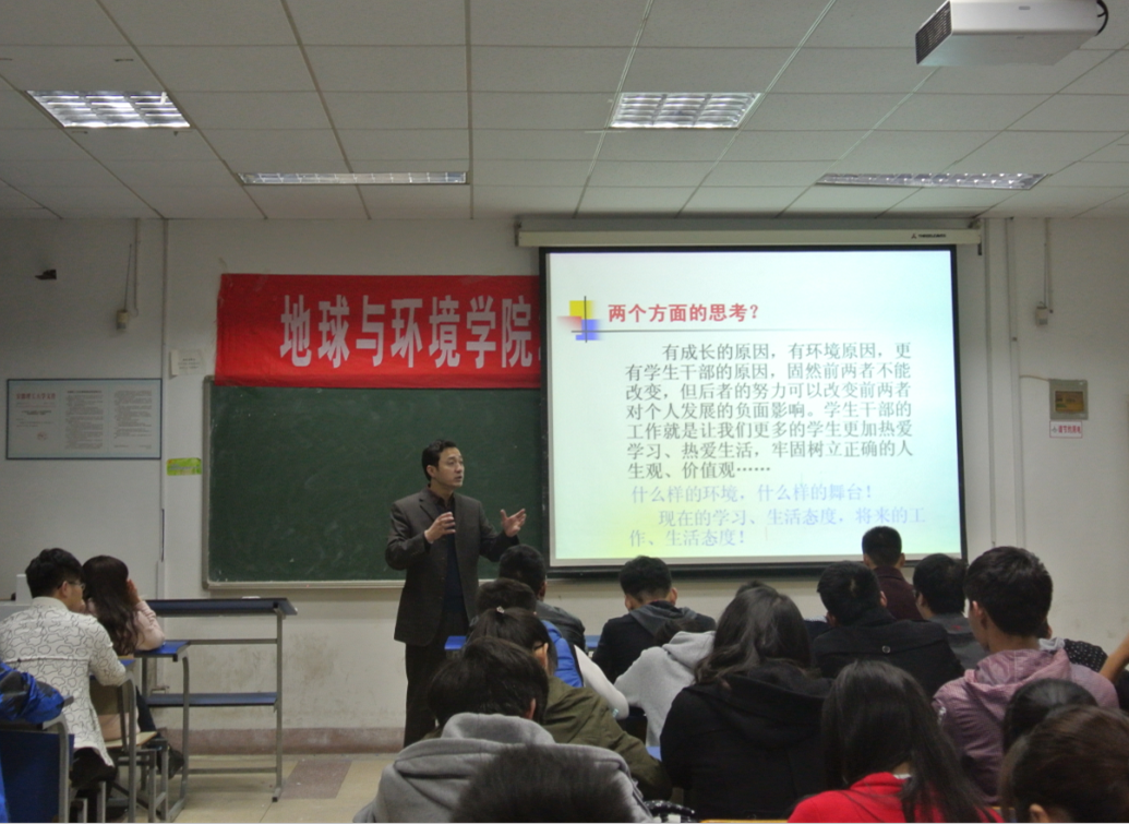 11月11日晚,地球与环境学院在北1502教室举办青马培训专题报告会。学院党委副书记侯辉为2014年“青马工程”培训暨大学生骨干培训班授课,作了题为“高校学生会自我教育、管理、服务功能的优化与提升”的专题报告。