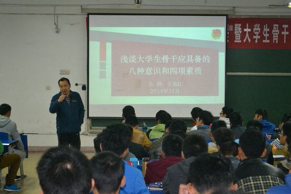 王先江作了题为《大学生骨干应具备的八种意识和四项素质》的讲座。他从学生骨干应具备的政治意识、责任意识、大局意识、服务意识、创新意识等方面入手,要求同学把个人命运与国家命运结合在一起,不断提升自身的政治素质、业务素质、道德素质与心理素质,做到勤于学习、善于思考、勇于探索、敏于创新,不断提高综合素质。
