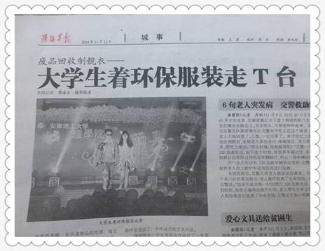 11月12日,《淮河早报》以《大学生着环保服装走T台》为题,报道理学院化装舞会特色节目——魔力T台秀。该节目由理学院学子们身着自己亲手制作的环保服装,给观众表演了一场令人惊叹的魔力T台秀,同时向大学生展示了低碳环保的理念。