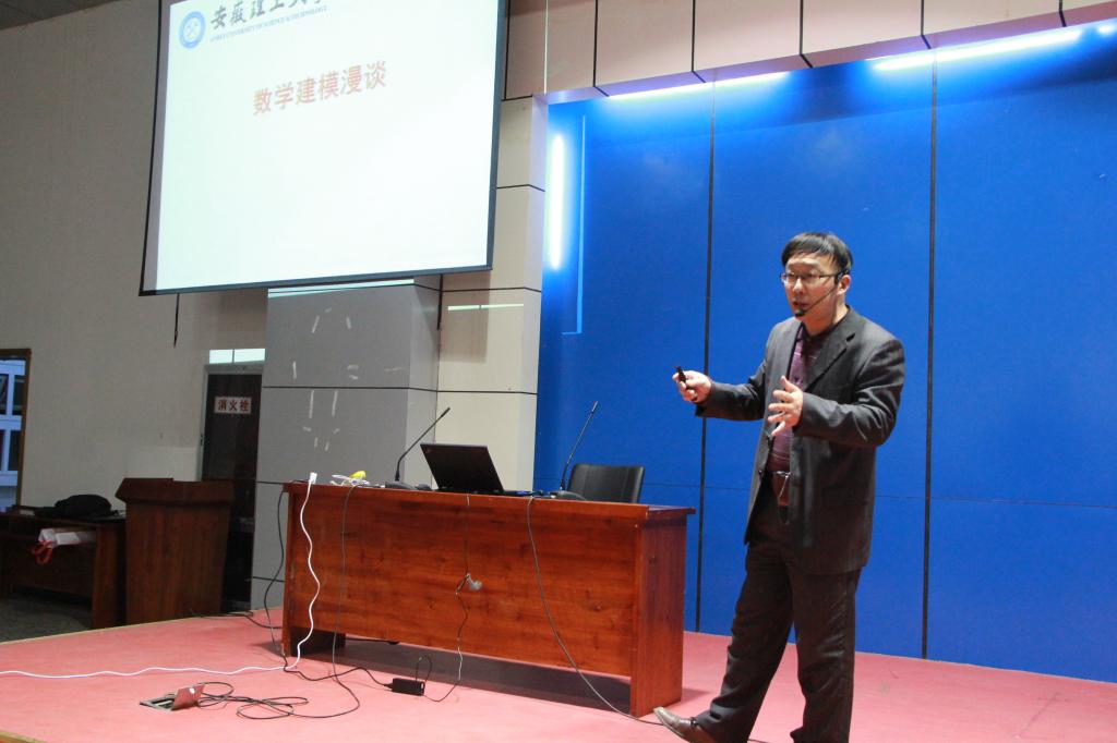 颁奖仪式结束后,许峰教授作了题为《数学建模漫谈——知识、软件、应用》的讲座。他从数学建模的起源、发展讲到安徽理工大学数学建模活动的现状,从数学方法讲到软件和编程,从论文写作讲到竞赛的经验,最后还介绍了用数学建模方法和技术解决采矿、机械和石油测井领域的实际问题,以展示数学建模的应用性和实用价值。他风趣幽默的话语和形象生动的描述不时引来同学们阵阵掌声。许峰呼吁广大学生积极参加数学建模活动,学好数学,用好数学。