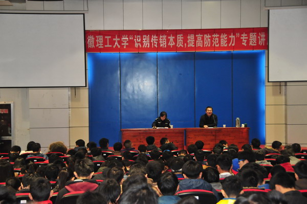 12月4日下午,保卫处、学生处在北校区图书馆二楼报告厅联合举办“拒绝传销,从我做起”反传销专题知识讲座。讲座由淮南市公安局经侦支队办公室主任承莉主讲。全校500多名师生代表聆听了讲座。