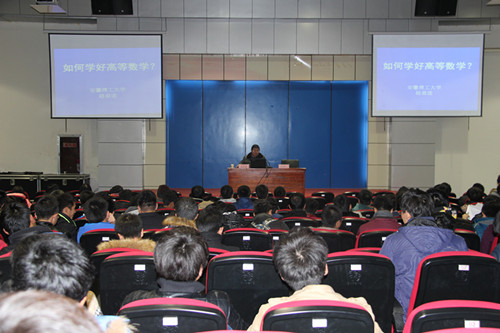 赵前进从什么是高等数学谈起,分析了学好高等数学的重要意义,指出高等数学范围广、用处多,为我们提供思维工具,是工科生考研和学好其它自然科学的重要基础。对于如何学好高等数学,他从大学与高中学习的区别出发,认为大学生学习高等数学主要存在速度快,更不上;概念、定理、理解不准确,不严密;听例题行,自己解题没思路;听课抓不住重点,复习没有深刻体会等问题。就如何解决学习高等数学中存在的问题,赵前进认为,首先需要同学们摒除认识误区,培养直接兴趣;掌握预习、听课、记笔记、复习、做作业、答疑的学习高等数学“六部曲”;建立学习型小组,相互竞争、相互帮助、解疑释惑。讲座中,赵前进还就典型公式的用法,典型例题证明、求解等与同学们进行了交流互动。