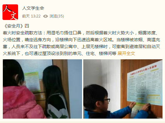 12月12日,人文学院院学生会成员进入各班级学生宿舍进行大学生安全知识教育与宣传,检查各个宿舍有无安全隐患。随后在各个宿舍张贴“大学生安全知识小贴士”,大家一起阅读并学习有关安全知识的内容,包括学生宿舍“六个严禁”、防火的基本措施、学生宿舍防盗基本方法等。与此同时,学院还通过官方微博和学生会QQ在网络上进行冬季安全知识的宣传教育活动。
