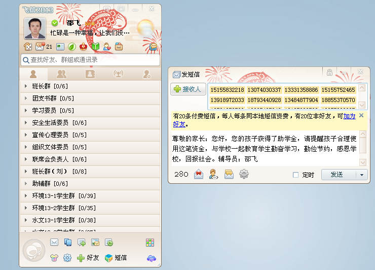 为进一步加强监督力度,各年级辅导员还向受奖助学生家长发送温馨提示短信,让家长督促学生合理使用奖助学金,配合学校共同做好受助学生的教育管理工作。