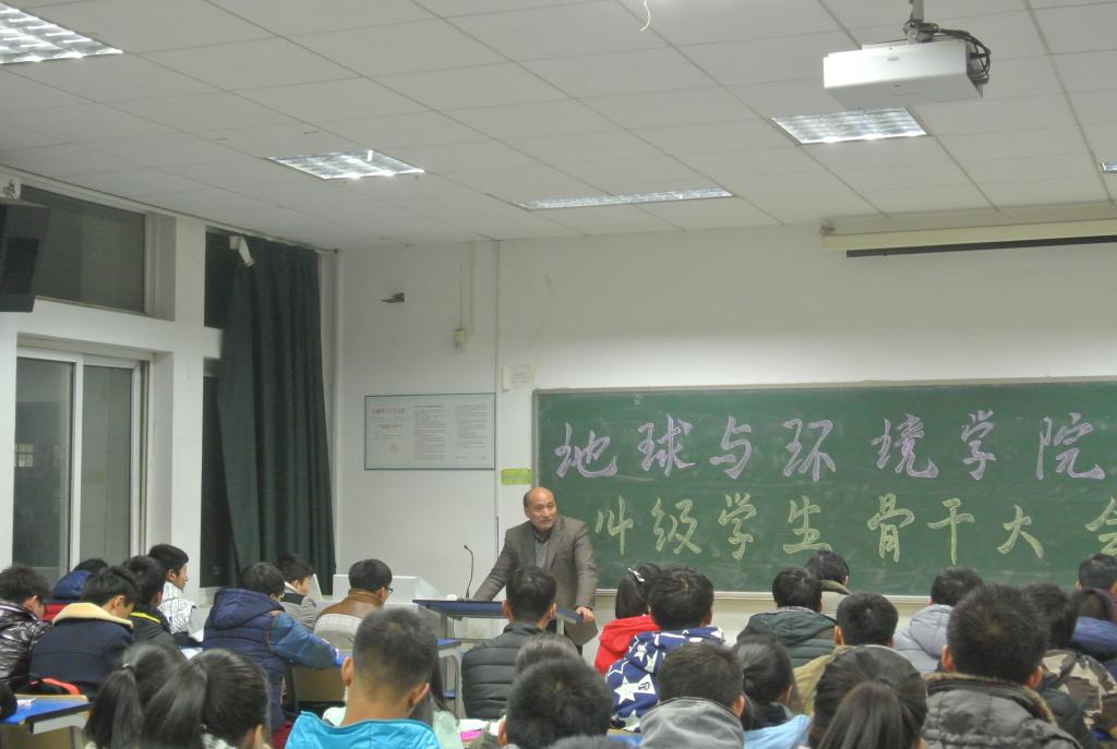为充分发挥学生骨干在校风、学风建设中的先锋模范作用,12月23日晚,地球与环境学院在北1502教室召开2014级学生骨干大会。学院党委书记盛鹏飞,副书记侯辉,辅导员邵飞、张贺海及2014级全体学生骨干100余人参加了会议。