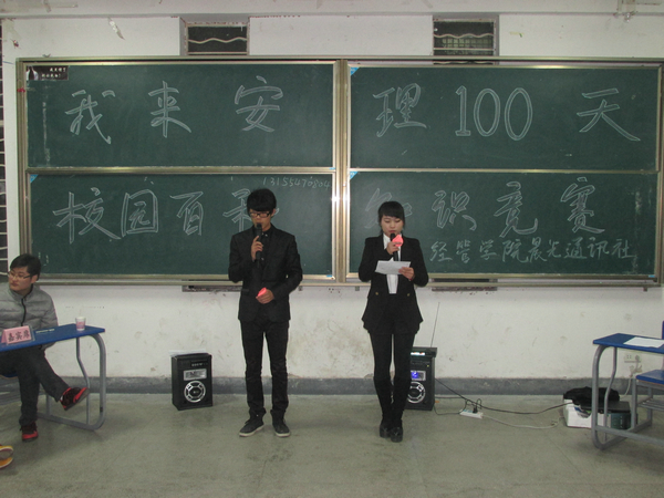 12月27日18:00,经济与管理学院晨光通讯社在经管楼108教室举办“我来安理一百天”校园百科知识竞赛。来自经管学院14级各班的共14支参赛队伍参加本次竞赛。