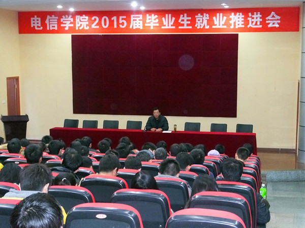 12月29日晚,电信学院2015届毕业生就业推进会在校本部六角楼报告厅(分两批次)召开。学院党委书记夏邦权、副书记徐关怀,辅导员胡怀利、孔海棠及2015届全体毕业生参加。