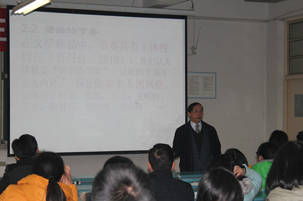 1月9日下午,应校科技产业处、外国语学院邀请,华东师范大学教授、博士生导师张春柏教授在西区医教101教室为外国语学院教师作了题为《文学翻译中的节奏与韵律》的学术报告。外国语学院党委书记、院长石秀光主持报告会。教学副院长程少武、科研副院长王宗华、行政副院长陶全胜与50多位教师一起聆听了报告会。