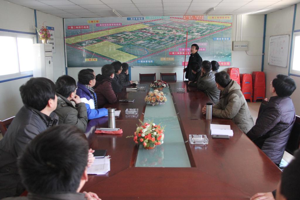 新校区建设指挥部工作人员介绍了新校区建设的总体规划及各标段工程项目进展情况,重点对学生食堂、学生公寓、水电设施、学生浴池、办公楼宇、校园环境等的规划设计、内涵意蕴、功能使用以及管理需求进行了详细说明。随后,全体人员实地参观了食堂、公寓、教室等施工情况。