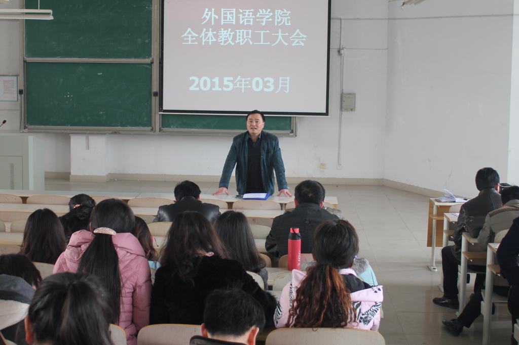3月9日下午,外国语学院在西校区医教403教室召开新学期全体教职工大会,通报学院当前工作情况,布置新学期工作。