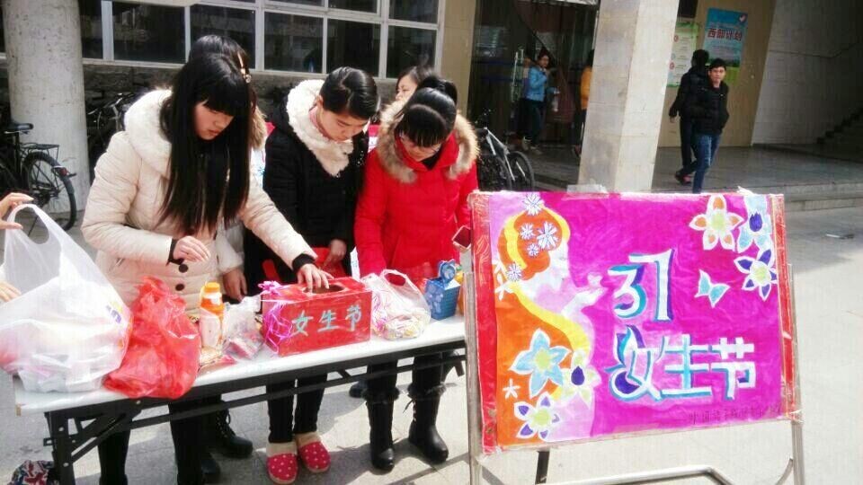 3月7日中午,外国语学院学生会女生部在西校区食堂门口举行女生节庆祝活动,关爱女生的自身思想素质、道德修养、文化内涵、业务能力和心理健康。全院100多名女生参加了此次活动。