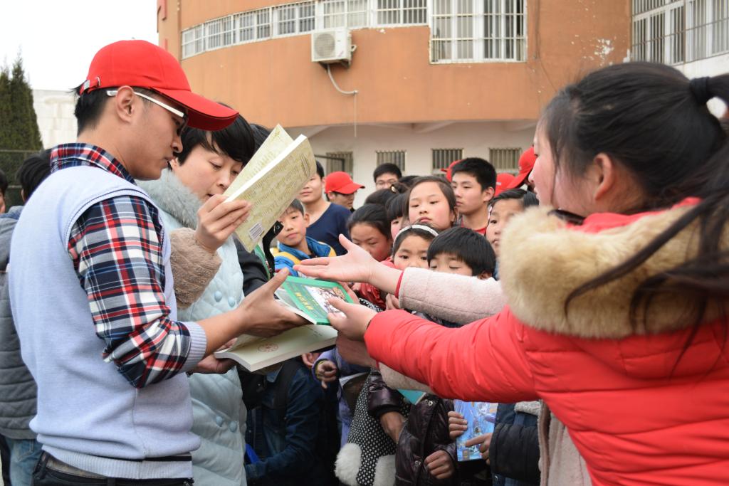 志愿者给小朋友发放爱心书籍