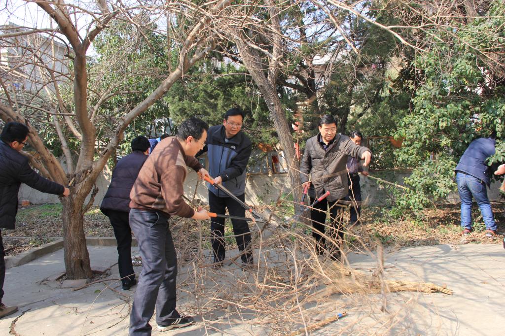 在社区主任刘则的陪同下,集团参加服务的党员们带着清理工具来到幼儿园,重点对幼儿园树木进行修剪,对教学楼楼前、楼后的枯枝落叶进行清扫。活动中,党员们充分发挥后勤集团的资源优势和技能优势,有的用高枝剪刀修剪旁枝,有的用手锯清理枯枝,有的用耙钉清理散落的枝叶,有的忙着用铁锹填埋石头和砖块。大家热情高涨,以劳动为荣,以服务为乐,充分展现了不怕脏、不怕苦、不怕累,敢于冲在前面,挑起重担的精神风貌。经过近两个小时的清理,幼儿园教学楼前后的树林和草地焕然一新。