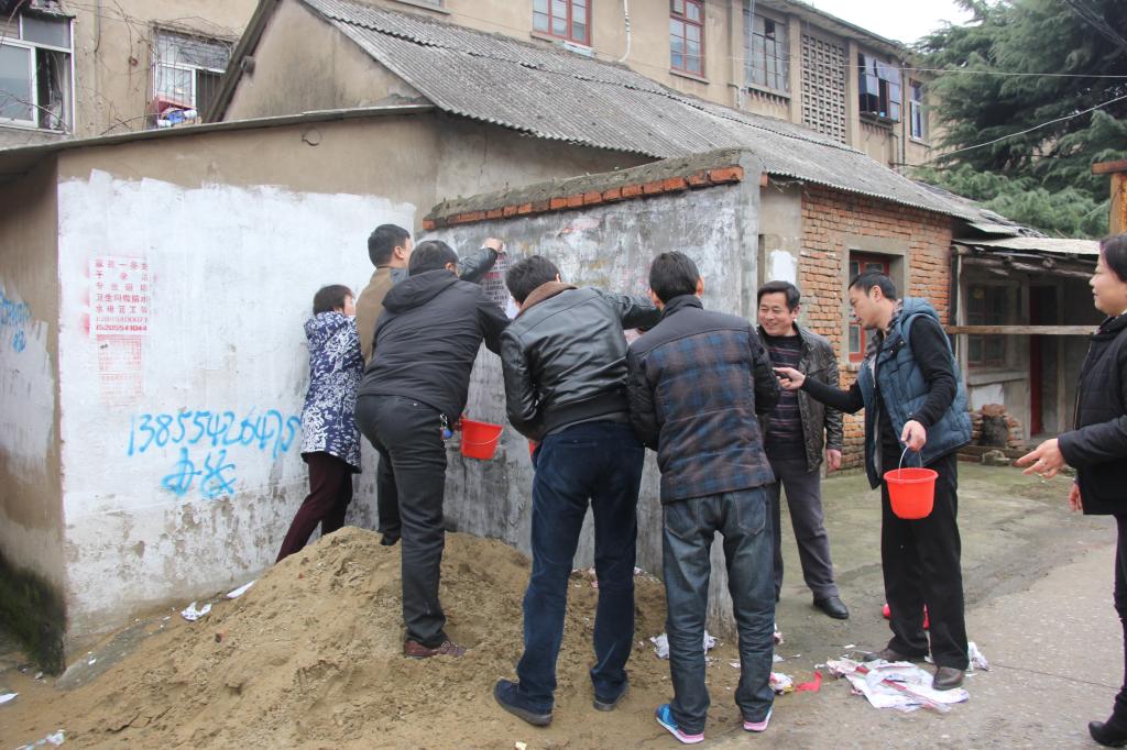 在职党员们集中清理墙壁上的“牛皮癣”(摄影:吴秀清)