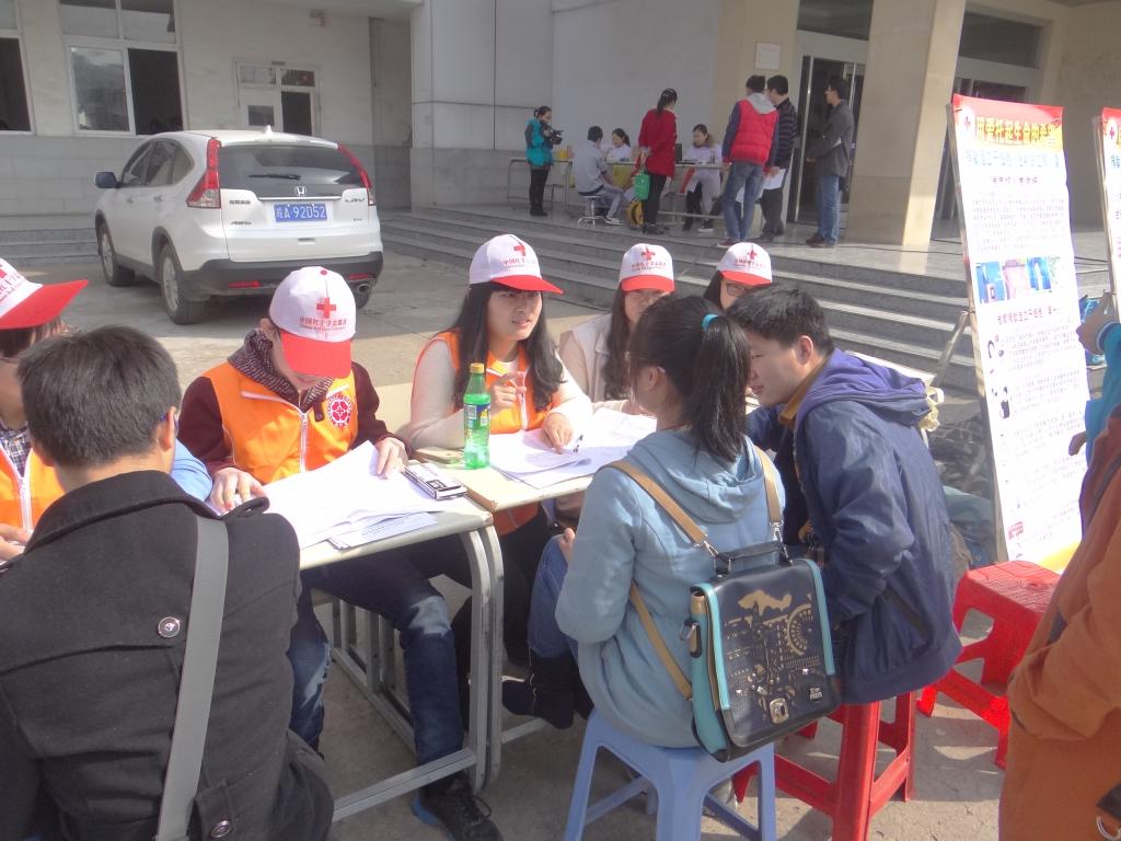 红十字会工作人员及志愿服务队的志愿者们于上午八点便到位开始了工作。志愿者们分成两部分,一部分负责在校园内向同学们宣传捐献造血干细胞活动的意义,另一部分向前来参加捐献的同学讲解一些捐献的注意事项以及填写相关表格。