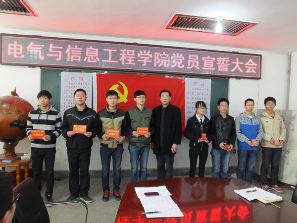 学院2014年12月发展的81名新党员面对党旗庄严宣誓,铿锵有力的宣誓显示出广大预备党员对党忠诚、为民服务的坚强决心。宣誓后,夏邦权为新增的“党员宿舍”和“党员床铺”授牌。