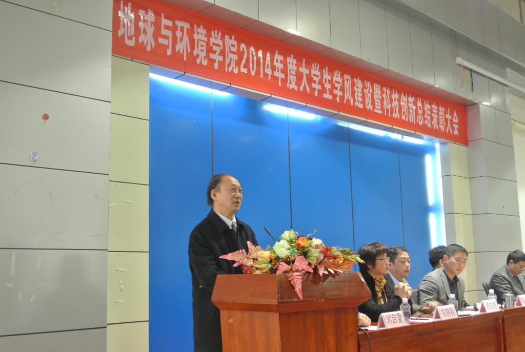 3月27日下午,地球与环境学院在北区图书馆二楼报告厅隆重举行2014年度大学生学风建设暨科技创新总结表彰大会。副校长叶醒狮应邀出席大会并讲话。校有关部门负责人和院党政领导出席了表彰会。表彰会由学院党委书记盛鹏飞主持。
