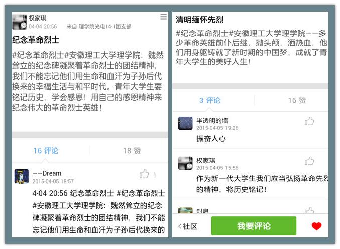 掌上清明活动是理学院首次使用校园微信平台开展主题教育活动。理学院各团支部负责人通过微信社区发布一个个革命英雄的故事,叙述中国革命的历史,赞颂革命英雄的伟大牺牲精神,并将中国革命精神与新时代的中国梦、社会主义核心价值观相联系,与青年大学生自身的成长成才相联系。学院青年团员积极参与到互动当中,通过校园微信平台发表评论、点赞。光电信息科学与工程14-1权家琪在微信中说道,“可爱的革命英雄:燃尽了自己的生命,保护了民族的子孙!巍然耸立的纪念碑凝聚着烈士们的奋斗历程和团结精神,革命英雄用他们的热血和身躯换来了中华民族的安定团结,铸造了新时代的中国梦,成就了当代青年们的远大理想。我们要铭记历史,学会感恩。”
