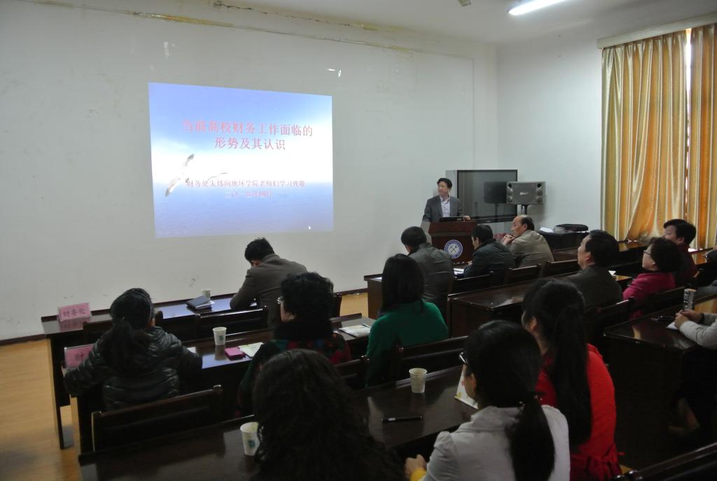 4月10日下午,地球与环境学院邀请校财务处处长朱炜,在学院201室为学院全体教职工作了题为《当前高校财务工作面临的形势及其认识》的专题培训。会议由学院党委书记盛鹏飞主持。