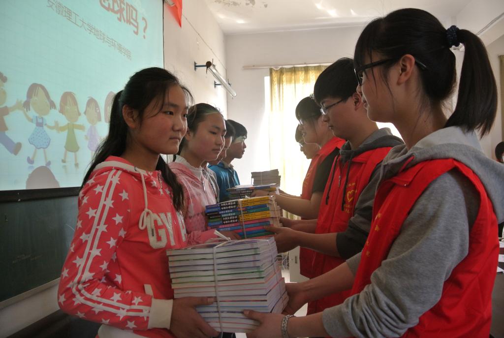 志愿者向实验学校学生赠送地球科普读物(摄影:邵飞)