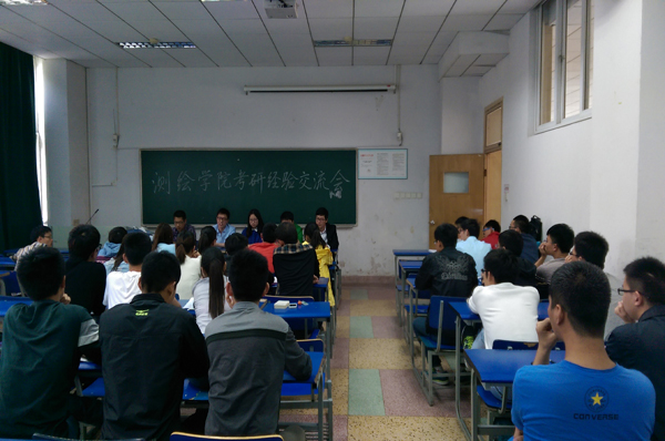 4月24日下午,测绘学院考研经验交流会在新教1106举行。在2015年考研中成绩优异、经验丰富的张进宏、田令文等五位同学,为2012级有考研意向的同学分享考研经验。
