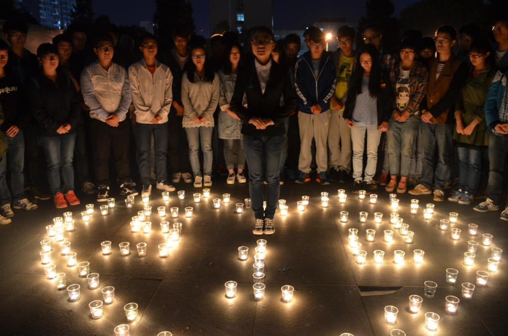 晚上8点,同学们聚集在实验楼广场前,用白色蜡烛摆成“5.12”字样,围绕以心形图案,寓意着我校学子心系灾区。随后,在四川籍学生的带领下,同学们举行了庄严肃穆的默哀仪式。仪式过后,同学们观看了防灾减灾专题图片展,认真学习了防灾减灾知识。