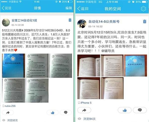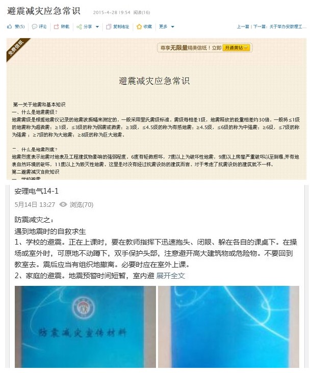 同时,学院各年级辅导员也利用微博、微信、qq等新媒体积极宣传防震减灾知识,在网上和同学们对“5.12”防震减灾日的活动进行了互动交流。