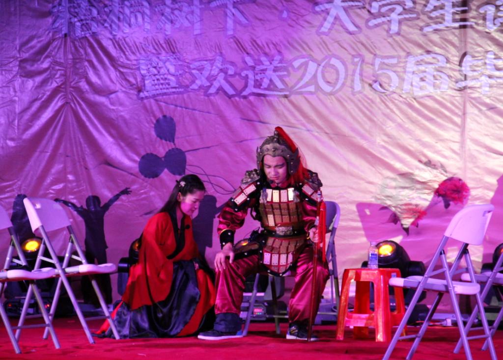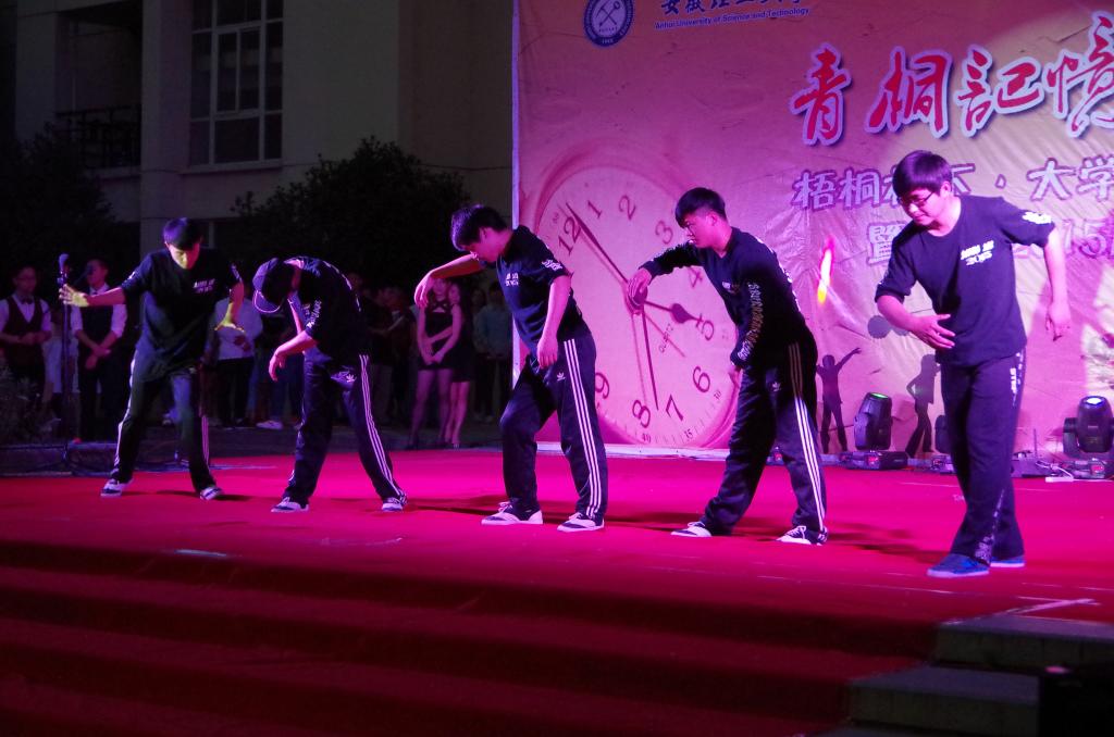 文艺晚会以“青桐记忆,致敬青春”为主题,分“畅想”、“求索”、“蜕变”、“梦圆”四个篇章。活泼优美、轻快灵巧的民族舞《万荷生》拉开晚会序幕,《歌曲联唱》勾起了大家对大学生活的无尽回忆,动作整齐干练的机械舞《old school》和奔放热情的爵士舞《短裙》尽显青春魅力,古韵十足、优美典雅的扇子舞《西湖山水》和快板《安理颂》表达了社区老人对大学生的关爱和期望……毕业生陈杰充满激情的独唱《海阔天空》诉说着离别之际的深深不舍,让不少毕业生们一度哽咽,将晚会推向了高潮;毕业生现场向学院赠送“师恩难忘”火药纹书法作品,表达对母校、对恩师的感恩之情。最后,晚会在《送别》的歌声中拉上了帷幕。