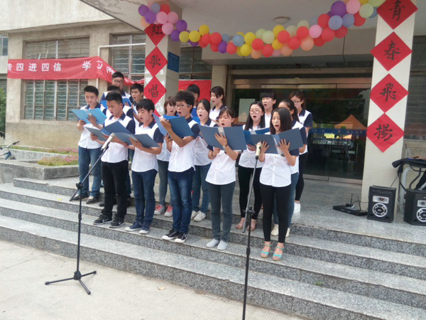 比赛在主持人精彩的开场白中拉开帷幕,各个班级代表队按之前抽签的顺序,依次上台演唱校歌及一首自选爱国曲目。各班都唱出了磅礴的气势,唱出了四射的激情,表达了一颗爱国、爱校的心。为了追求更好的效果,许多班级还积极创新表演形式,令人耳目一新。