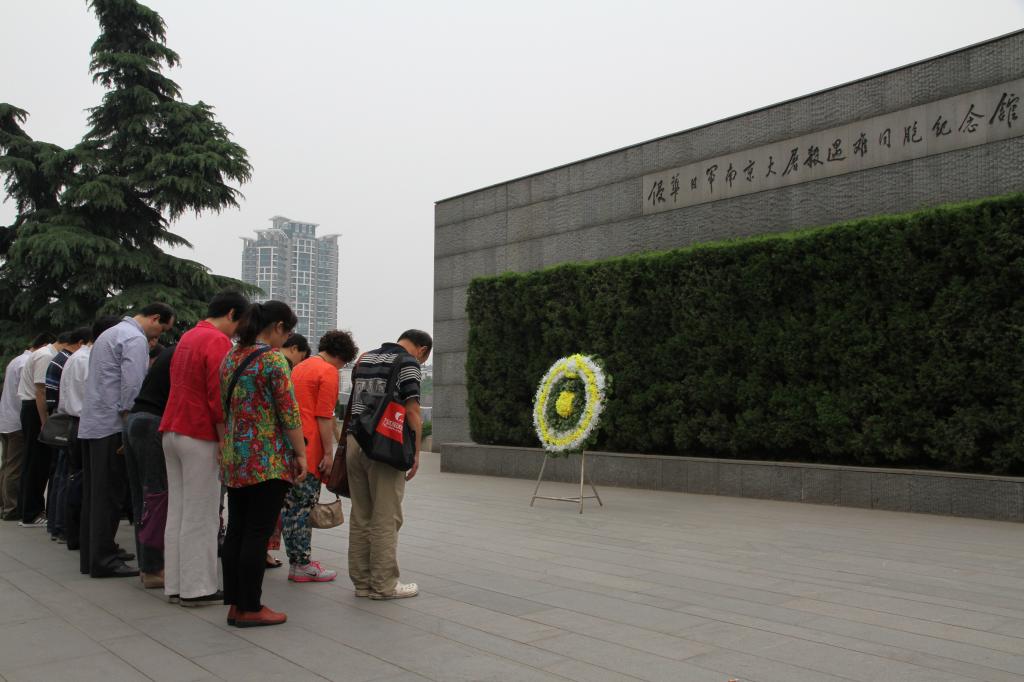 南京大屠杀就是一个沉痛的国耻,一章血腥的历史,一场灭绝人性的屠杀,一段永不遗忘的记忆。大家一走进“侵华日军南京大屠杀遇难同胞纪念馆”,首先映入眼帘的是令人震撼的纪念馆的外形,如同船头、又像一把折断的军刀,线条突兀而尖锐,如刀劈斧削,直刺人心。而入口处所展示的一组组家破人亡、苦苦挣扎的苦难人民雕塑,更让人心情沉痛、压抑。在史料陈列厅,伴随着大量的图片文字实物等资料又仿佛让人进入了那一段黑暗的岁月,面对那满壁的遇难者名单和一幕幕残忍的屠杀再现场面,令人语言失色。大家怀着无比沉重的心情,在墓地广场向大屠杀遇难同胞敬献花圈,默默悼念,寄托哀思。
