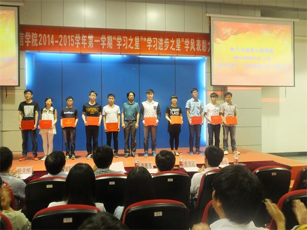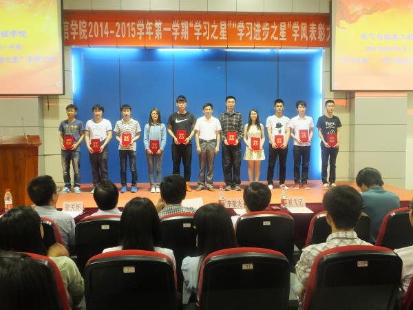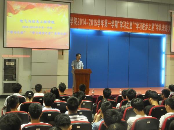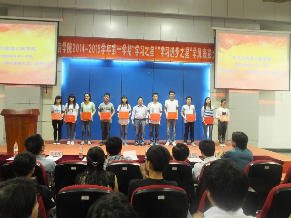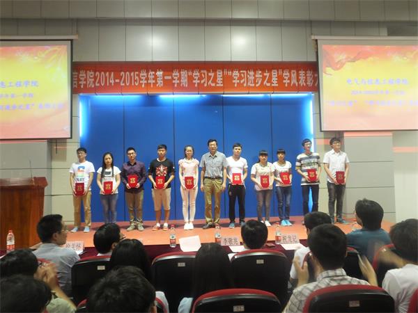 学院党委副书记徐关怀宣读表彰决定。表彰电子信息工程2013-2班等8个优秀学风班级,15栋217寝室等33个优秀学风宿舍,吴涛等61名学习之星,项成等32名学习进步之星。