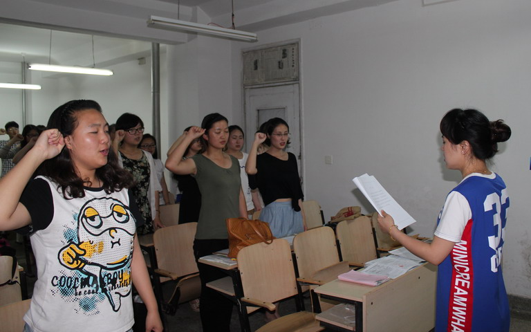 5月31日下午,在学院七楼教室,高年级学生党支部书记、辅导员肖婷老师带领毕业生党员们重温了入党誓词。在庄严的党旗下,肖婷希望毕业生党员们站好最后一班岗,发挥模范带头作用,做文明离校的先锋,带动全体2015届毕业生同学文明离校;寄语全体毕业生党员始终牢记党的宗旨,坚守理想信念,在今后的工作中善于学习,不断完善自我,勇于担当时代赋予的责任,为中华民族的伟大复兴而努力奋斗。