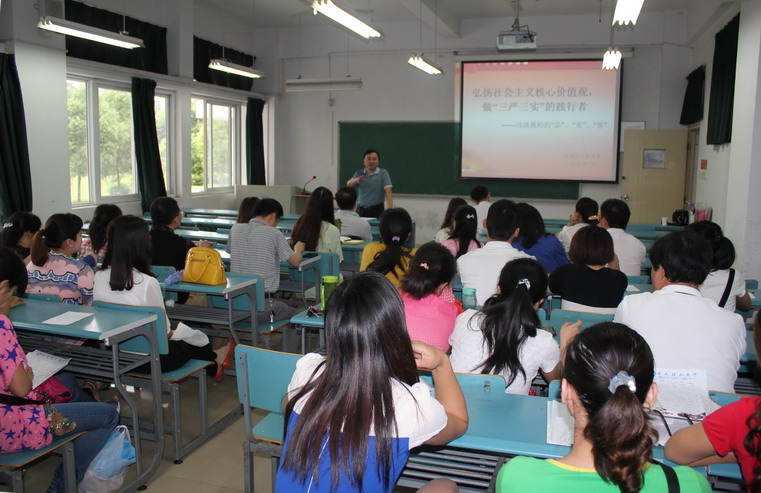 6月4日下午,外国语学院在西区医教103教室举行“三严三实”专题教育党课报告会,院党委书记、院长石秀光作了题为《弘扬社会主义核心价值观,做“三严三实”的践行者——浅谈教师的“品”、“爱”、“能”》的主题报告。学院领导班子、支部书记、科级干部和教师党员参加了报告会。