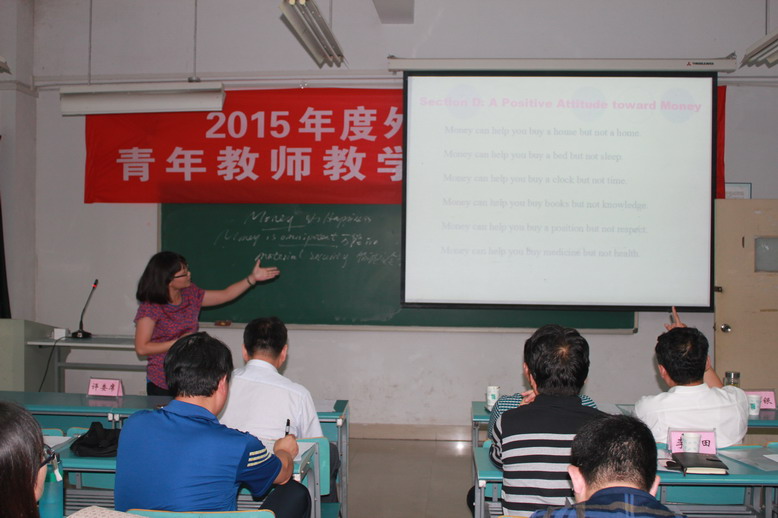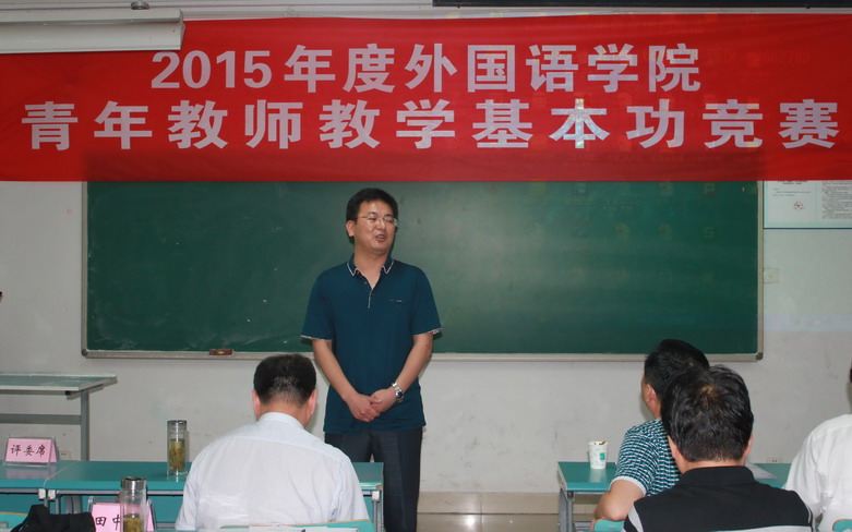 6月24日下午,外国语学院在西区医教104教室举行2015年度青年教师教学基本功竞赛,从各系初赛脱颖而出的8位青年教师参加比赛。教务处、研究生院、发展规划处、学生工作处、人事处、实验室与设备管理处与校工会等单位领导应邀担任评委。比赛由学院党委书记、院长石秀光主持。