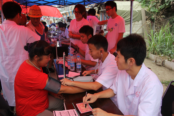 7月10日上午,我校2015年暑期社会实践国家级重点团队——大学生爱心医疗服务团在阜阳市临泉县滑集镇镇卫生院开展义诊义检帮扶活动,我校附属医院(淮南市东方医院集团总院)心血管内科主任李枫教授、儿科主任任彩云副教授、骨科副主任柏文昆副教授、妇产科主治医师万丽等4名长期从事临床工作的医学专家,跟随服务团一同来到滑集镇服务当地群众。活动受到了当地居民的一致好评。