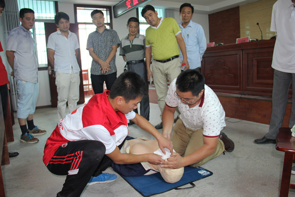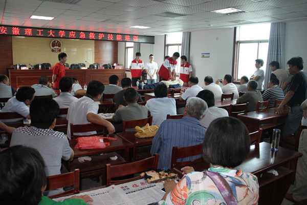 培训课上,结合农村居民实际情况,我校安徽省红十字会应急救护培训师用简朴的语言、生动的事例、明了的方法讲解了日常生活中常见的外伤止血、包扎、骨折等突发事件以及心肺复苏等自救互救知识。多名培训师在模拟人上同步模拟示范,并让村民参与实际操作,使村民们一听就懂,一学就会。