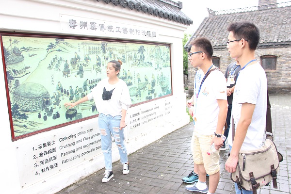 当天上午,调查团首先来到位于淮南市八公山区的淮南天宝“双遗”文化园——这里是“寿州窑”、“紫金砚”两个省级非物质文化遗产制作技艺的传承研究、创新发展、收藏展示为核心内容的人文景观。在讲解员带领下,调查团成员来到紫金石博物馆、寿州窑展示馆、非物质文化遗产文化研发传承基地,欣赏到了隋代的青釉盘口瓶、唐代的黄釉四系大罐等古代真品以及方见尘、路福传等大师的作品。同时,深入了解了泥料加工、拉坯、上釉、晾干、装窑、烧制等古窑制作的全过程。随后,调研团又来到了八公仙阁实地参观调研。