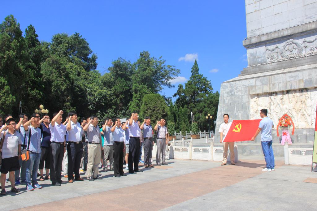 在苍松翠柏的掩映下,红军广场显得格外庄严肃穆。拾级而上,党员代表向革命烈士纪念塔敬献了花篮,张勤春带领大家向革命烈士三鞠躬,表达了对英烈们的深切怀念和崇高敬意。全体党员在廖学东带领下重温入党誓词,面向鲜红党旗,庄严地举起右手宣誓,再次表达了为党的事业奋斗终身的决心和愿望。