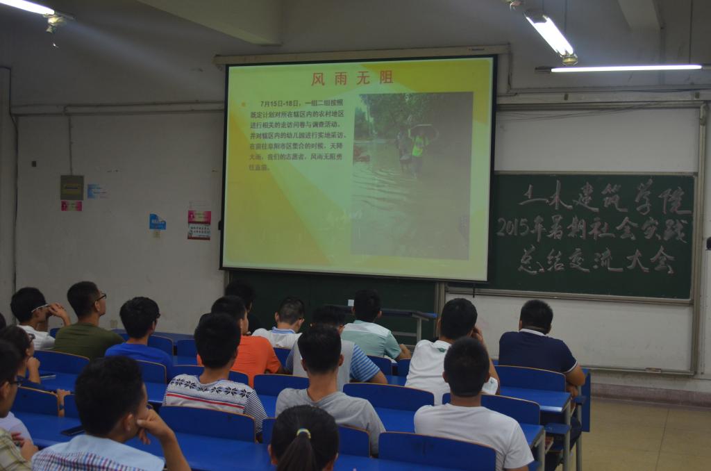 9月1日晚,土木建筑学院在北校区2101教室举行了2015年暑期“三下乡”社会实践总结交流大会。学院各实践团队成员等100余人参加了会议。