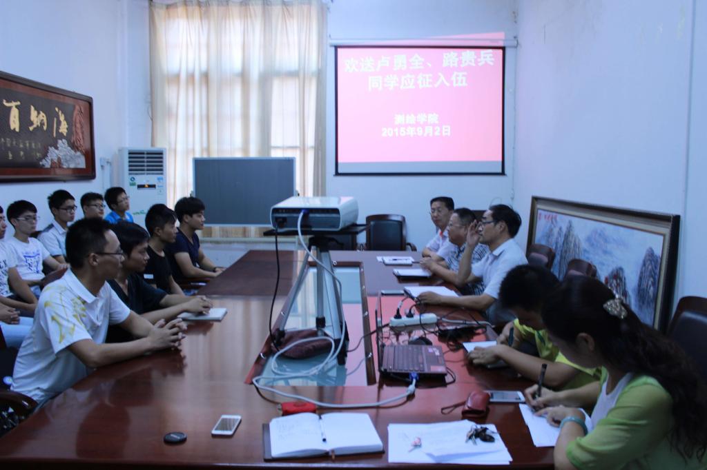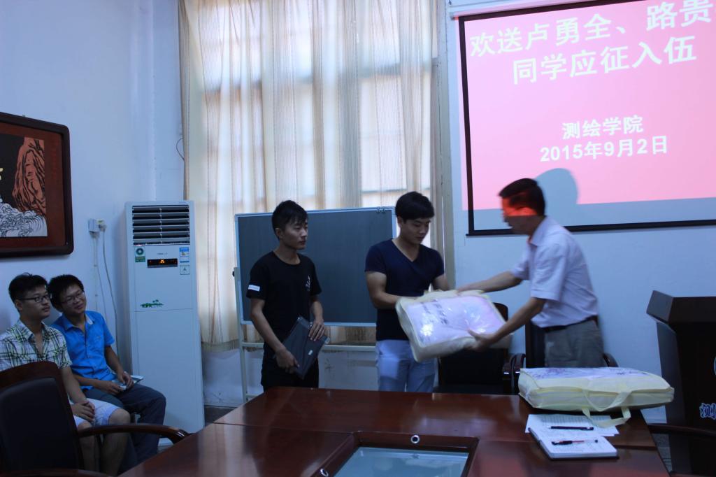 9月2日下午,测绘学院在院学术报告厅召开2015年参军入伍学生欢送会。院长赵志根、党委副书记吴军、副院长姚嗣宏,学工办、综合办老师及应征入伍的学生参加了欢送会。