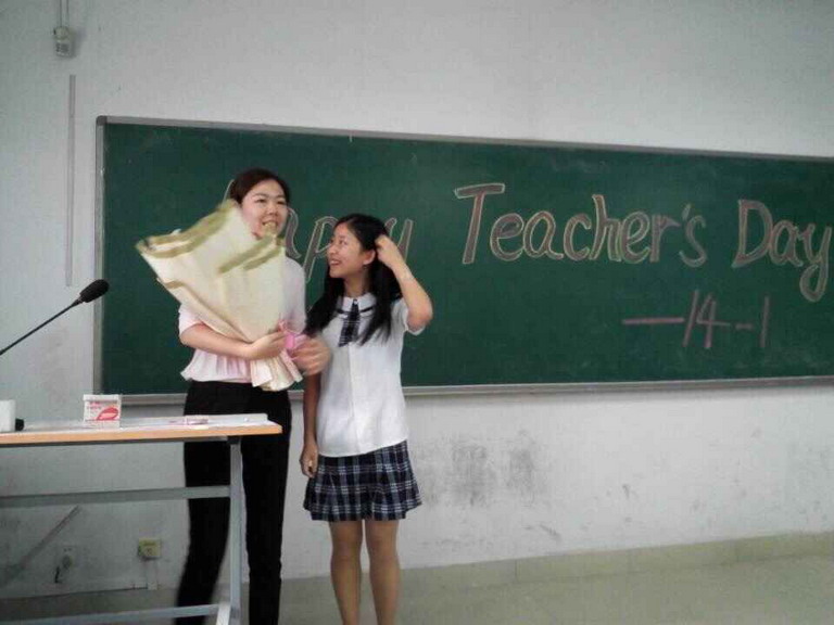 沐浴着初秋的晨风,同学们早早地来到教室,端坐在座位上,黑板上书写着“Happy Teachers’ Day!”醒目的祝福语,讲桌上摆放着一瓶清透的矿泉水。当老师推门走进教室,同学们一同起立, “Happy Teachers’ Day!”,在整齐的祝福声中,班长双手呈上一束美丽芬芳的鲜花,温馨的一幕让老师非常感动。“I am very happy. Thank you very much!”周宁老师激动地对英语2014-1班的学生们说道。在另一间教室里,温情同时上演,令郑大伟老师惊喜不已。