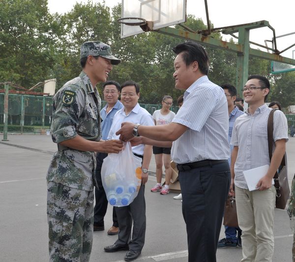 9月27日,土木学院党委书记盛真、院长马芹永、党委副书记丁志强、副院长庞建勇等一行深入北校区篮球场,亲切看望慰问军训新生,并与2015级新生共度中秋佳节。