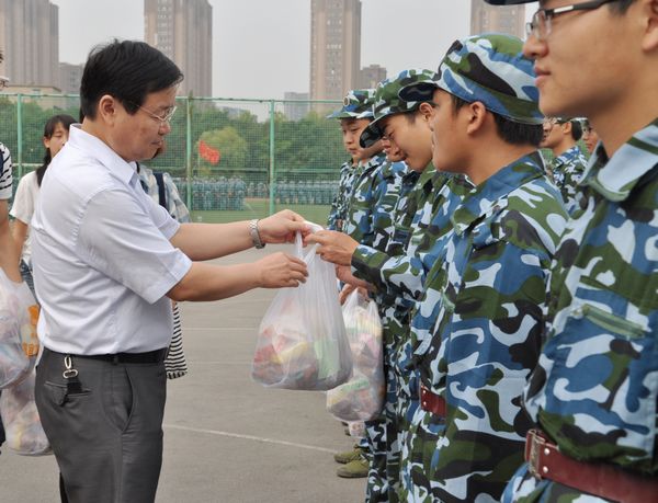 学院领导还为学生送上了精美的月饼,并代表学院全体师生向2015级新生及军训教官致以节日的问候。盛真代表学院从新生如何适应大学生活,如何确定远大理想和目标等方面,提出了几点建议和要求,勉励同学们珍惜来之不易的学习机会,鼓励大家把军训作为入学第一课,历练意志,遵守纪律,尽早适应大学环境,学会学习,学会生活,以优异的成绩回报家长和社会。
