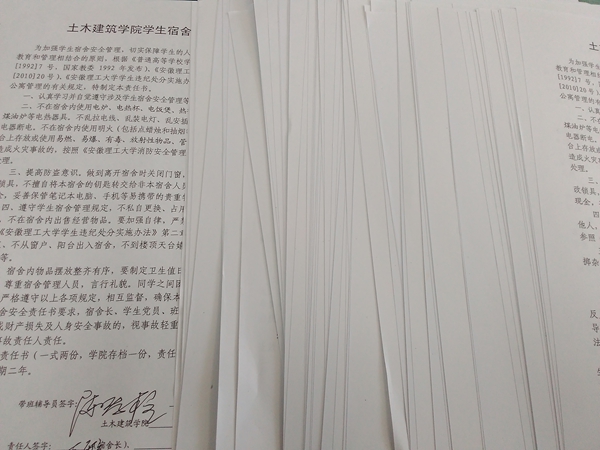 9月25日,各年级辅导员对各宿舍进行了大走访,对新生进行了学生手册里有关宿舍管理规定的相关宣传和讲解,积极关心学生的思想、学习、生活,深入了解把握学生的思想动态,正确引导学生特别是新生合理安排假期生活,并监督和指导新生填写学生安全责任书。通过宿舍走访,学院把工作落实到每一间宿舍、每一位学生,认真查找安全方面的漏洞或事故隐患,梳理存在的突出问题,采取有效措施,迅速解决安全隐患,确保学生安全度过快乐、充实的假期。