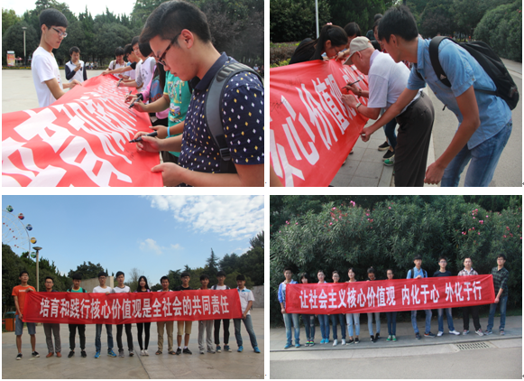 9月28日至10月6日,理学院2014级、2015级各班级团支部掀起“我心中的核心价值观”学习浪潮。各班级团支部通过核心价值观电影展播、校园大清扫、宣传签名、个人代言等方式为心中的核心价值观代言。