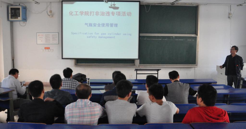 为深入贯彻学校“打非治违”专项整治行动,切实加强实验室气瓶规范管理和使用,10月16日下午,化学工程学院在新附2203教室举办气瓶安全使用管理专题报告会。校保卫处处长李明,化学工程学院党委书记徐冬生,以及学院研究生听取报告。报告会由张洪流主持。