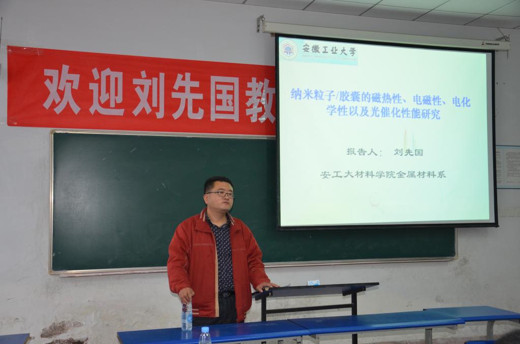 11月13日下午,应科技产业处、化学工程学院邀请,安徽工业大学刘先国教授来校,在新教1307教室作了题为《纳米粒子/胶囊的磁热性、电磁性、电化学性以及光催化性能》的学术报告。化学工程学院教师和研究生参加了报告会。