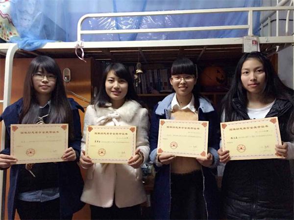 荣梦雨,中共党员,连续三年获得国家励志奖学金、优秀学生干部、优秀共青团干部等;陶文益,中共党员,连续三年获得国家励志奖学金、三好学生等;田文凤,连续两年获得国家励志奖学金、校三等奖学金、优秀学生干部、优秀共青团员、三好学生等;张莹,获得国家励志奖学金、校一等奖学金、校三等奖学金、校三好学生等。目前,荣梦雨和陶文益都已获得保送至华东理工大学进行硕博连读的资格,田文凤和张莹也都在为考研进行紧张的备考。