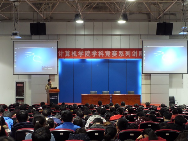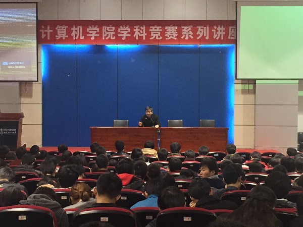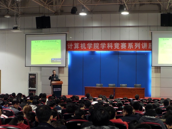 11月22日下午,计算机学院于北区图书馆报告厅举办了学科竞赛讲座。学院院长陆奎、副书记蒋群及辅导员出席了本次讲座。2014、2015级学生聆听了讲座。讲座由蒋群主持。